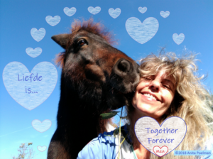 Ik zie een paard (een witte bonte) en loop er naar toe. Het was alsof de tijd stil stond. Neus aan neus stonden we, stil, roerloos en gebiologeerd, en we werden door elkaars energie opgenomen. Er ontstond een telepathische communicatie, en ineens sprak ik hardop uit wat ik voelde. “Als ik ooit een paard mag hebben dan wil ik hem. Voor hem zal ik nooit bang zijn”.